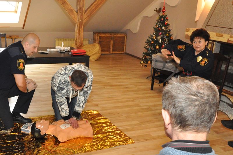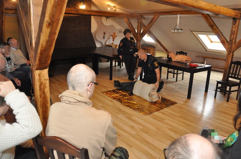 W szkoleniach w Pensjonacie św. Łazarza udział biorą pracownicy ośrodka, wolontariusze i osoby wychodzące z bezdomności. 8 lutego zajęcia z pomocy przedmedycznej prowadzili st. insp. Halina Ceglińska i mł. insp. Piotr Kożuch. Funkcjonariusze zaprezentowali między innymi jak należy postępować z osobami nieprzytomnymi. Strażnicy miejscy pokazali jak zadbać o swoje bezpieczeństwo na miejscu zdarzenia, w jaki sposób stwierdzić czy osoba oddycha, jak wezwać pomoc oraz w jaki sposób należy jej udzielić. Osoby biorące udział w szkoleniu próbowały masażu serca na szkoleniowym fantomie, a także zobaczyły jak prosta jest obsługa defibrylatora.