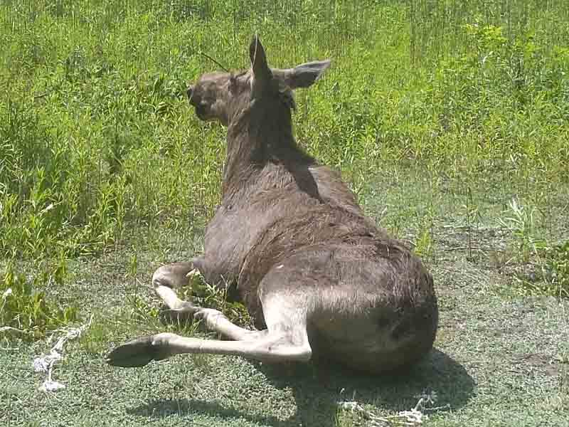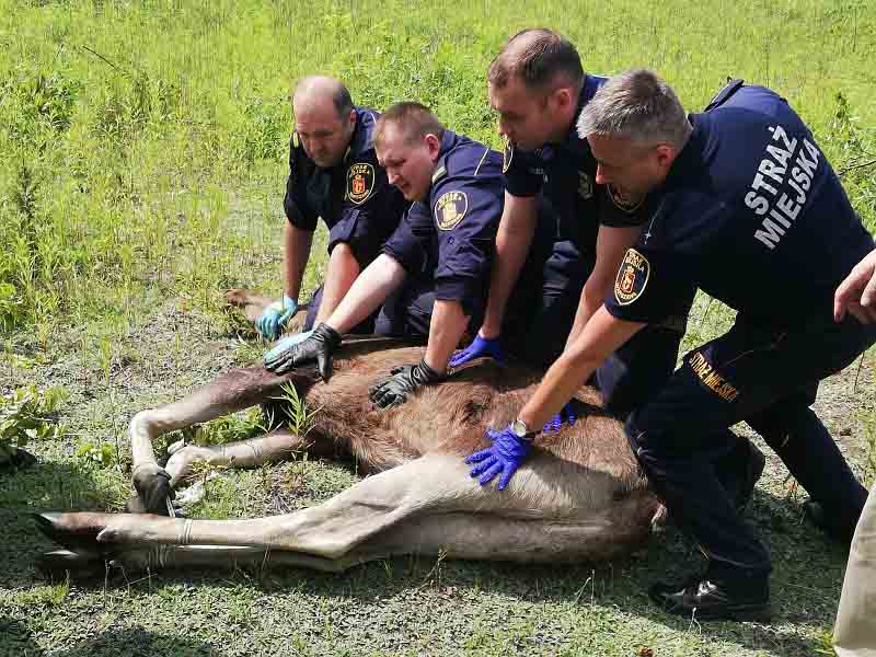 Gdy funkcjonariusze przybyli na miejsce, potwierdzili, że informacja jest prawdziwa. Po terenie posesji dostojnie spacerował młody łoś, a dokładnie samica łosia. Funkcjonariusze zabezpieczyli teren, tak aby zwierzę nie zrobiło komuś i sobie krzywdy, a następnie wezwali łowczego. Samica łosia wyglądała na zdrową, tylko trochę wystraszoną. Łowczy zdecydował, że chcąc złapać zwierzę, trzeba je uśpić. Środek usypiający zaczął działać po kilku minutach. Gdy samica usnęła, wspólnymi siłami udało się umieścić ją w samochodzie transportowym i bezpiecznie przewieźć ją do Kampinosu. Środowisko naturalne będzie dla niej o wiele lepszym i bezpieczniejszym miejscem.