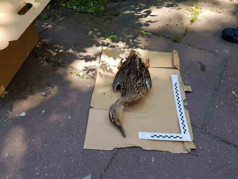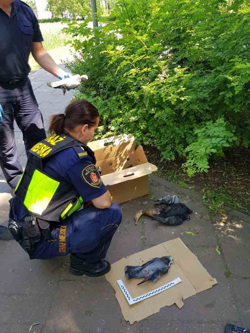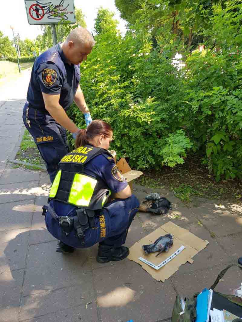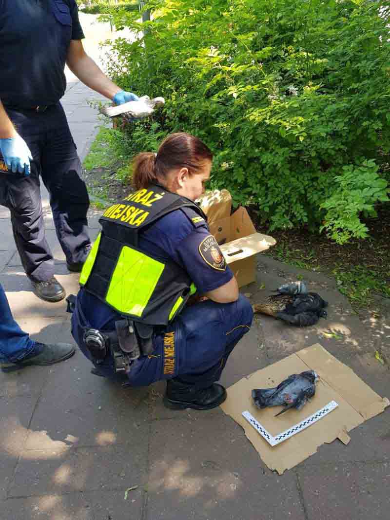 Informacja niestety potwierdziła się. Funkcjonariusze na miejscu znaleźli w sumie czternaście padłych ptaków: dwanaście gołębi, jedną kaczkę i jedna kawkę. Obok ptaków Ekopatrol ujawnił karmę, prawdopodobnie zatrutą. W związku z tym, że zachodziło podejrzenie celowego działania otrucia zwierząt, strażnicy wezwali na miejsce policję, Sanepid oraz Powiatowego Lekarza Weterynarii. Część martwych ptaków oraz karma została zabezpieczona do dalszych czynności.