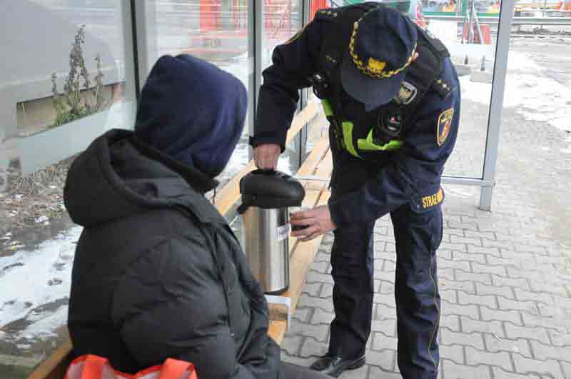 Gdy radiowóz dojeżdża do przystanku autobusowego przy ul. Olbrachta funkcjonariusz zauważa, że śpi na nim bezdomny. Radiowóz zatrzymuje się. Mężczyzna podnosi głowę. Po chwili rozmowy prosi o ciepłą herbatę. Nie potrzebuje innej pomocy. Nim odejdzie przychodzi inny bezdomny.