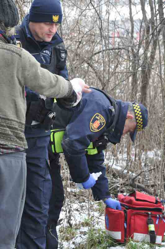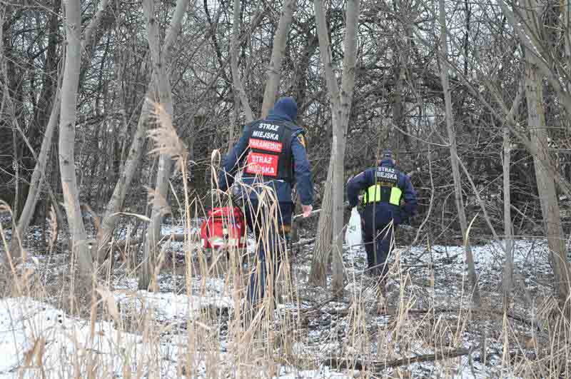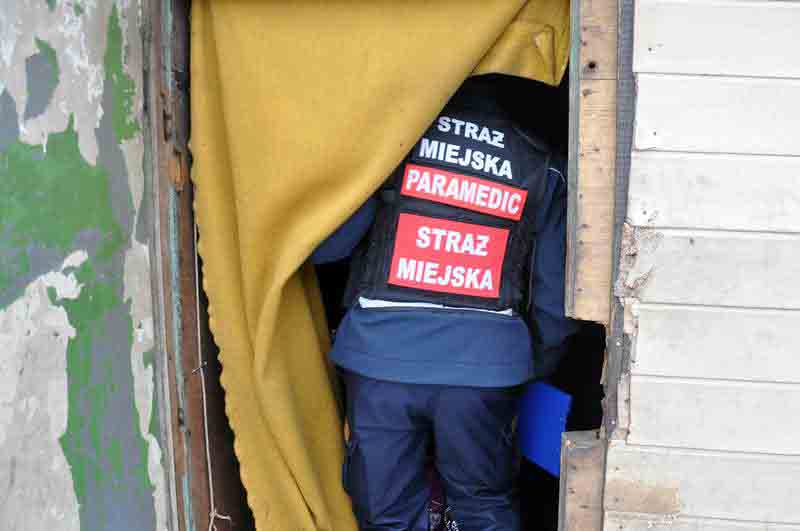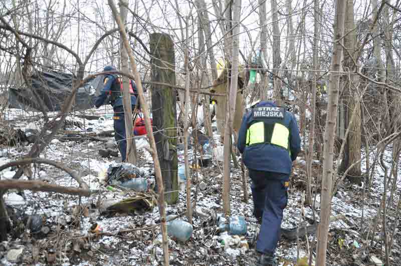 Ostatnie odwiedzone miejsce w tym patrolu mieści się na kępie krzaków pomiędzy torami kolejowymi. Pośród gęstej krzewiny wygrzebuje się z wielkiej sterty śmieci ok. 50 letni mężczyzna. Mieszka tam razem ze szczurami. Miesiąc temu oparzył sobie dłoń. Strażnicy miejscy zdejmują brudny bandaż, dezynfekują rany i zakładają nowy opatrunek. Na koniec bezdomny dostaje gorącej herbaty z sokiem.