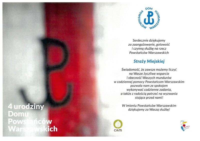 „Serdecznie dziękujemy za zaangażowanie, gotowość i czynną służbę na rzecz Powstańców Warszawskich”- napisali w liście do strażników miejskich weterani powstania, którzy na co dzień korzystają z Domu Powstańców Warszawskich. List z podziękowaniami, z okazji 4. urodzin placówki, odebrała Magdalena Ejsmont, Komendant Straży Miejskiej
