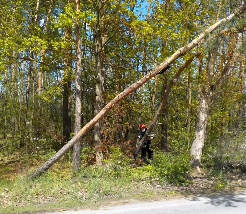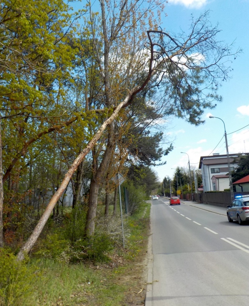 Ulica Przyrzecze leży w sąsiedztwie granicy Białołęki i Jabłonny. Domy jednorodzinne i niewielkie firmy są zlokalizowane pomiędzy zaroślami i niewielkimi zagajnikami. To tam przed południem 6 maja złamało się wysokie na kilkanaście metrów drzewo. Ponieważ niebezpiecznie zawisło nad ulicą, wezwano strażników miejskich. Funkcjonariusze zabezpieczyli teren. Powodem złamania był prawdopodobnie silny wiatr. Do usunięcia zagrożenia wezwano straż pożarną. Sosna została pocięta i złożona na terenie leśnym.