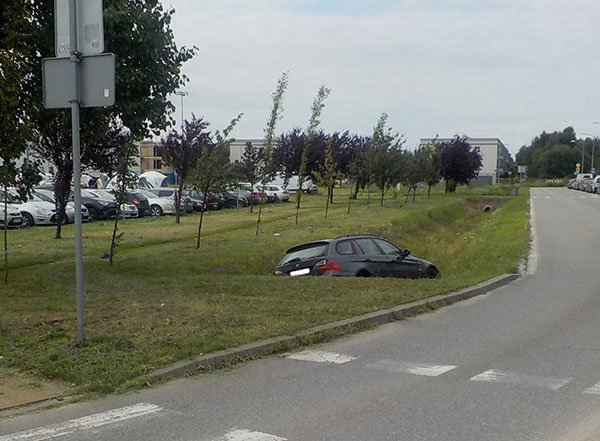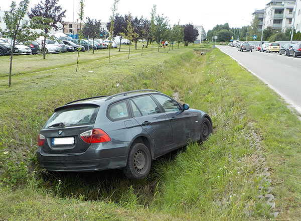 Dochodziła godzina 15.45, gdy strażnicy miejscy z VI Oddziału Terenowego otrzymali niepokojące zgłoszenie z Lewandowa. Jeden z mieszkańców widział, jak na ulicy Geodezyjnej zaparkowany samochód marki BMW nagle zaczął staczać się do rowu melioracyjnego biegnącego wzdłuż ulicy. Po chwili auto skąpało się w wodzie. Kilka minut później funkcjonariusze zabezpieczyli miejsce zdarzenia. Na podstawie numerów rejestracyjnych ustalono 34-letniego właściciela pojazdu i powiadomiono go o niefortunnej przygodzie jego auta. Wydobyciem zajęła się pomoc drogowa.