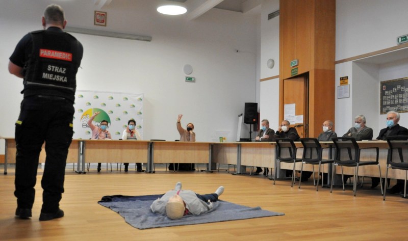 Szybko okazało się jednak, że białołęckim seniorom nie wystarczy wiedza na temat odpowiedniego wyposażenia apteczki czy zasad prowadzenia rozmowy z dyspozytorem karetki pogotowia. Uczestnicy ekspresowego kursu zadawali wiele szczegółowych pytań, a także wyrazili chęć przeszkolenia z pomocy w przypadkach omdleń, przeszkolenia z prowadzenia masażu serca w resuscytacji krążeniowo-oddechowej, a nawet – z obsługi defibrylatora AED.