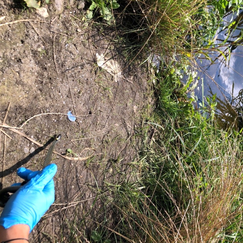 Ponieważ ten gatunek lubi wodę i tereny podmokłe, Ekopatrol przewiózł zaskrońca nad Wisłę i wypuścił gada przy zaroślach na brzegu. Zaskroniec najpierw napił się, by zaspokoić pragnienie, a potem żwawo czmychnął do wody.
