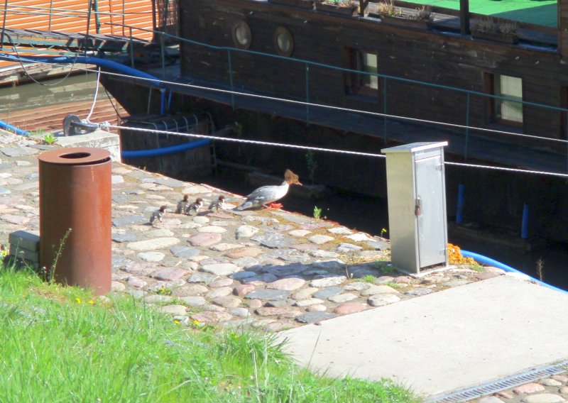Święto Flagi rodzina nurogęsi postanowiła uczcić spacerem przez… Czerniakowską. Na szczęście dla nich w pobliżu był patrol referatu ds. Kontroli Środowiska. Funkcjonariusze wstrzymali ruch uliczny co pozwoliło całej rodzince przejść bezpiecznie na druga stronę ulicy. Po dłuższej chwili mama gęś pływała wraz z ośmiorgiem młodych po Kanale Piaseczyńskim.