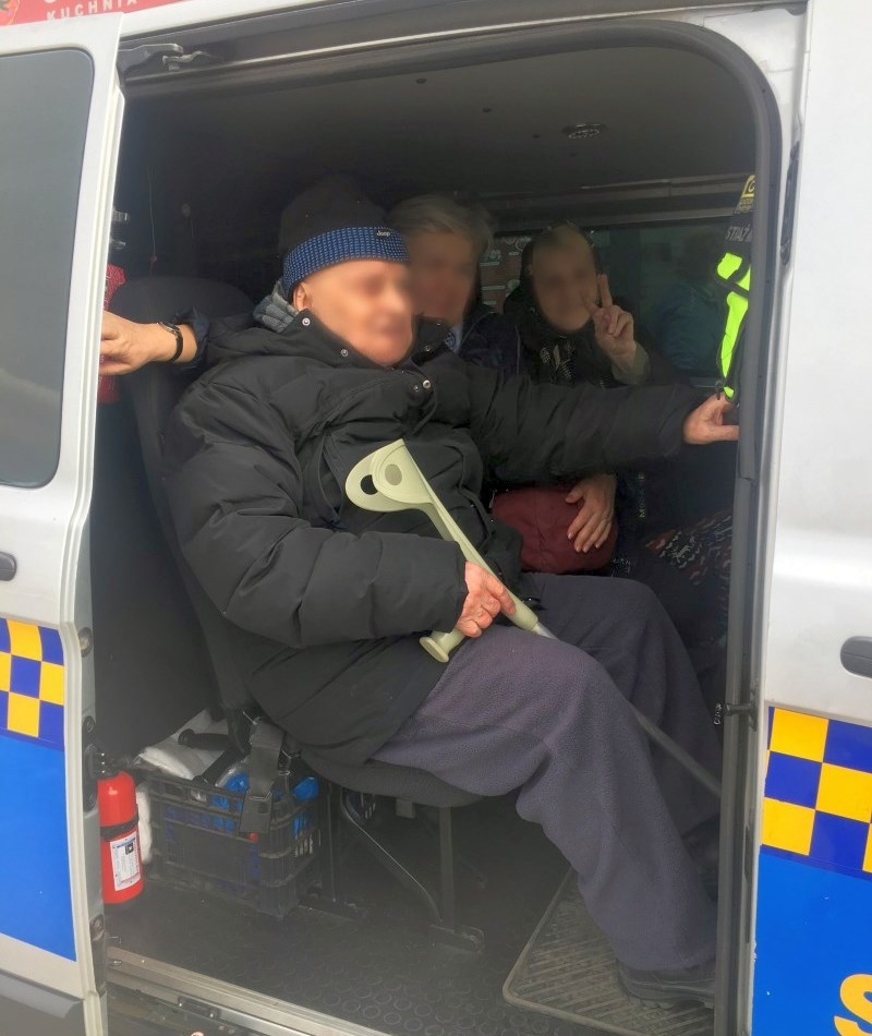 Jedna z funkcjonariuszek Oddziału Ochrony Środowiska, która rankiem 26 marca pełniła służbę na dworcu, zauważyła wysiadającego z autobusu starszego mężczyznę. Senior z racji podeszłego wieku (90 lat) miał problem z poruszaniem. Strażniczka zaproponowała pomoc. Na wózku inwalidzkim mężczyzna został odprowadzony do ratownika medycznego. Towarzyszącym mu kobietom wskazano poczekalnię dla uchodźców. Pół godziny później jedna z nich podeszła do funkcjonariuszki i poinformowała, że wraz z rodziną została ewakuowana z Kijowa przez jedną z organizacji pomocowych. W Warszawie miał na nich czekać jej przedstawiciel. Jednak nikogo na dworcu nie było. Funkcjonariuszka potwierdziła tożsamość rozmówczyni i telefonicznie próbowała skontaktować się z organizacją. Niestety, nikt nie odbierał telefonu. W wyniku dalszych czynności ustalono, że rodzina jest częścią grupy, która ma rezerwację w jednym z hoteli na Mokotowie. Niezbędny był specjalistyczny transport dla mężczyzny na wózku. Ponieważ nie udało się załatwić samochodu, który przewiózłby mężczyznę, strażnicy miejscy zdecydowali, że senior zostanie przewieziony do hotelu radiowozem. Jeszcze przed południem starszy pan mógł po ciężkiej i męczącej podróży odpocząć w towarzystwie bliskich.