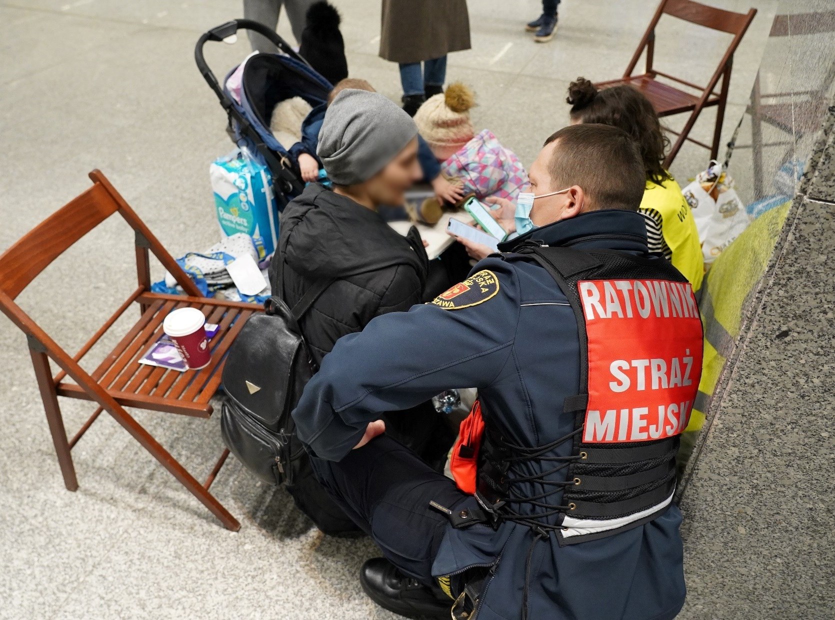 Na Dworzec Zachodni w Warszawie codziennie dociera kilkadziesiąt autobusów z uchodźcami z Ukrainy. Wśród służb i osób, które niosą pomoc przybyszom, od początku są strażnicy miejscy.