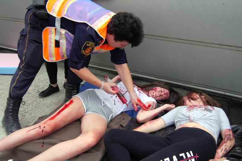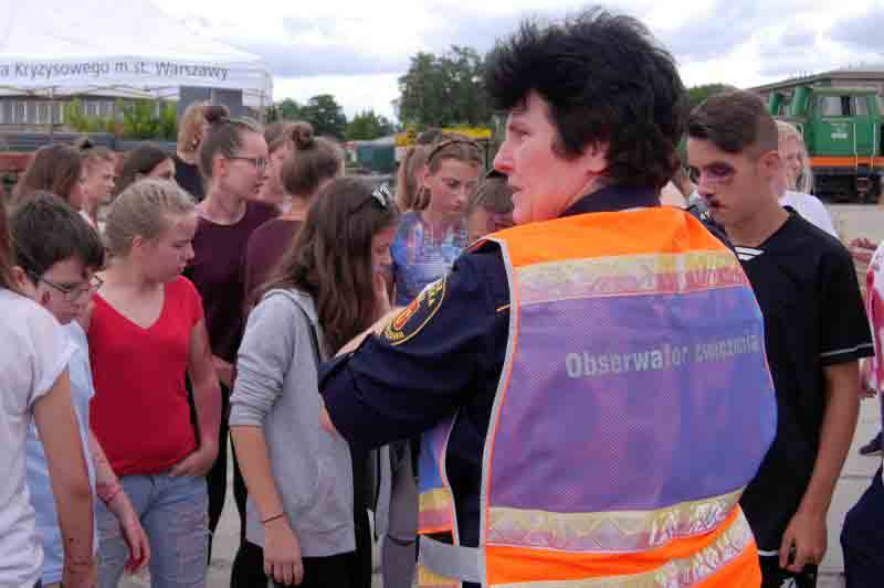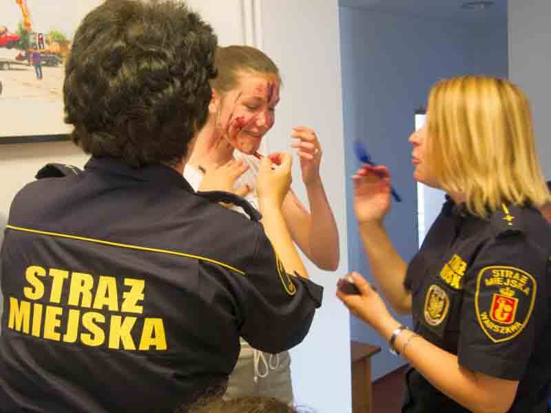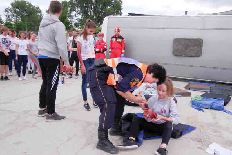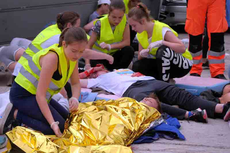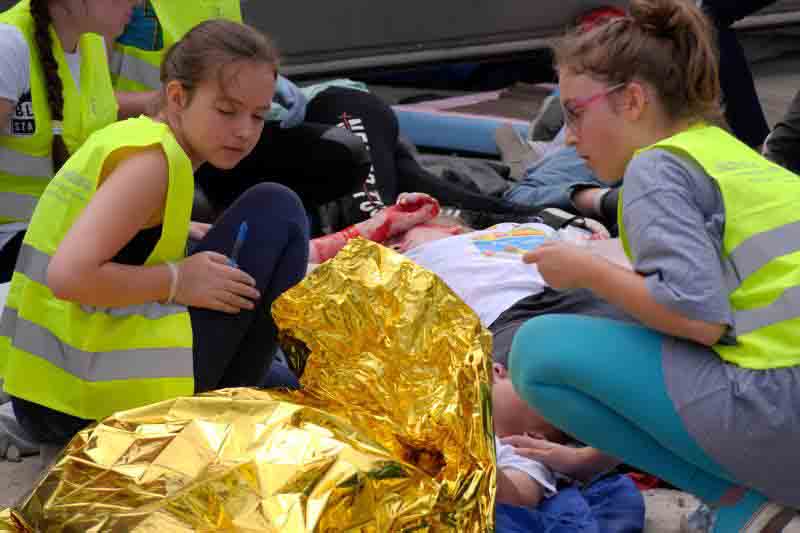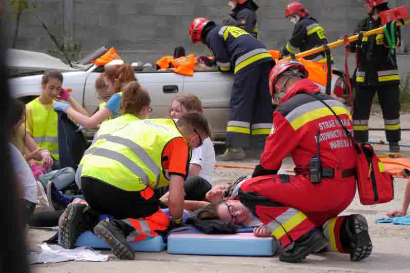 Na koniec szkolenia przewidziano symulację wypadku drogowego: autokar wiozący dzieci zderzył się z dwoma samochodami osobowymi. Uczniowie nie znali scenariusza ćwiczeń, zmuszeni więc byli działać zgodnie z wypracowanymi schematami. Jeszcze przed przybyciem ratowników zabezpieczyli miejsce wypadku, udzielili „poszkodowanym” pomocy, wstępnie segregowali też rannych w zależności od stopnia obrażeń.