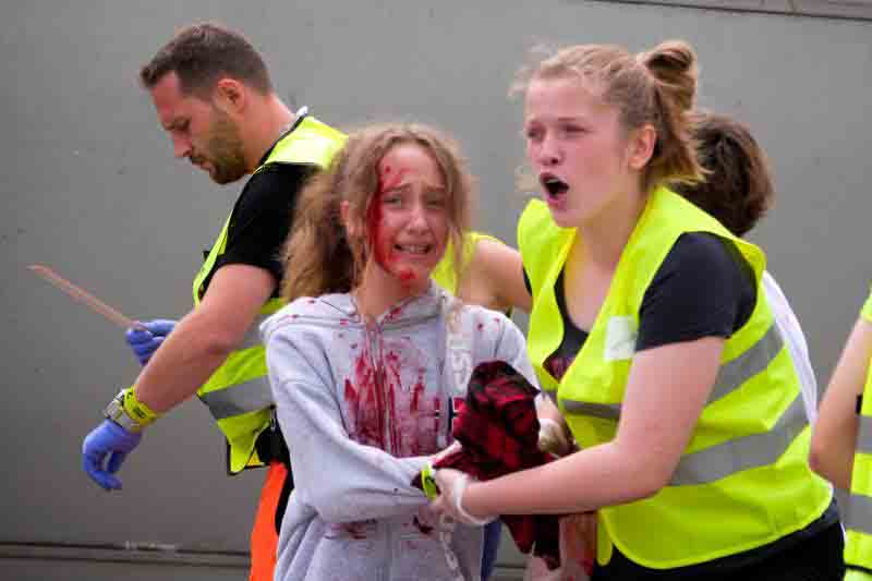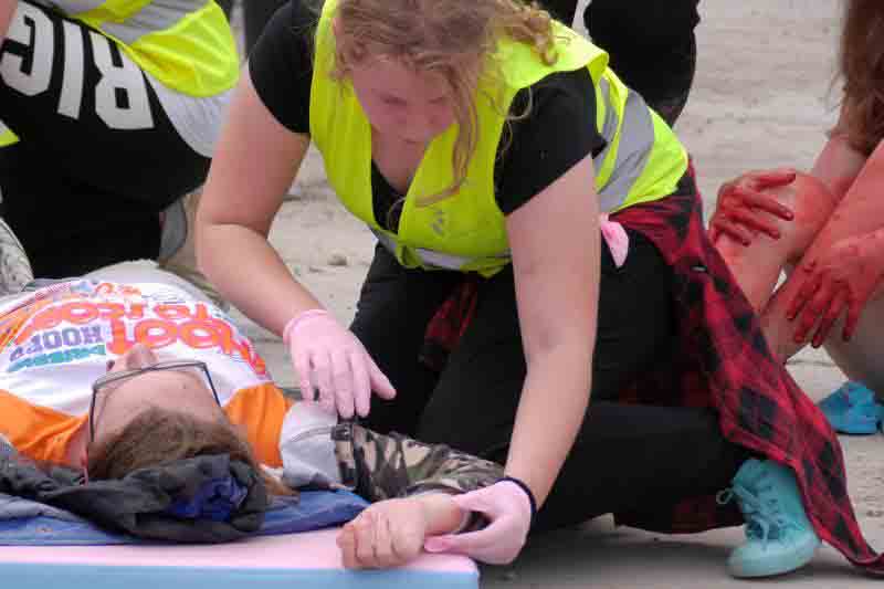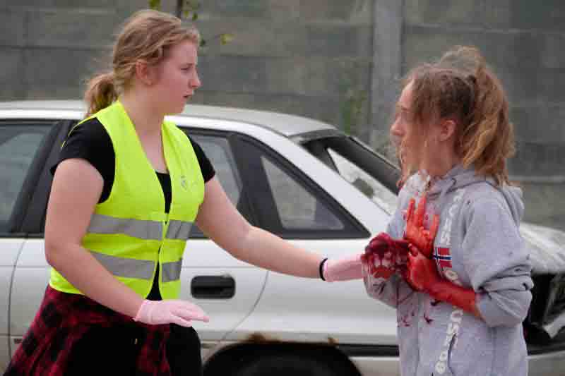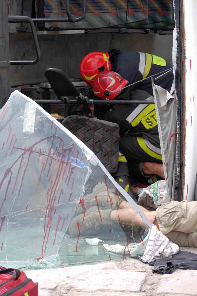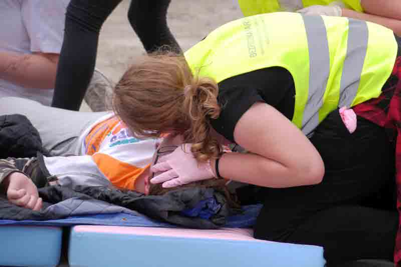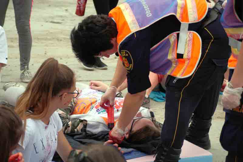 Na koniec szkolenia przewidziano symulację wypadku drogowego: autokar wiozący dzieci zderzył się z dwoma samochodami osobowymi. Uczniowie nie znali scenariusza ćwiczeń, zmuszeni więc byli działać zgodnie z wypracowanymi schematami. Jeszcze przed przybyciem ratowników zabezpieczyli miejsce wypadku, udzielili „poszkodowanym” pomocy, wstępnie segregowali też rannych w zależności od stopnia obrażeń.