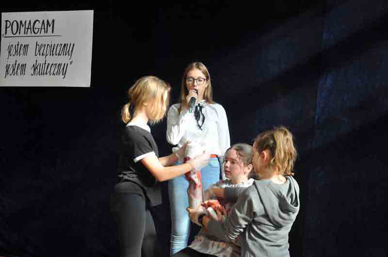W piątek 12 października program „Pomagam, jestem bezpieczny, jestem skuteczny” został zakończony. Dzieci pokazały elementy szkolenia – postepowanie z osobą nieprzytomną, osobą, która doznała zadławienia oraz osobą poszkodowaną w wypadku, która doznała amputacji kończyny. Na koniec uczestnicy otrzymali drobne upominki zawierające m.in. maski do sztucznego oddychania. Wręczał je Maciej Świątek, naczelnik VI Oddziału Terenowego.
