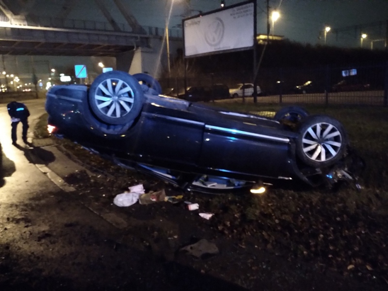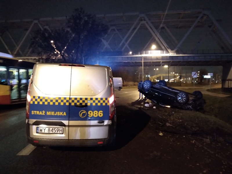 uszkodzony samochód leżący na dachuDo groźnego wypadku doszło w nocy 13 grudnia na Pradze Północ. Jadący ulicą Radzymińską samochód marki Volkswagen przewrócił się na dach. Jego kierowca zbiegł z miejsca zdarzenia. Pojazd zauważyli patrolujący ten rejon strażnicy miejscy.