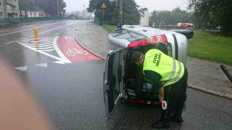 11 lipca około 14.00 strażnicy, jadący na zleconą interwencję, zauważyli na wysokości ulicy Lizbońskiej leżący na boku samochód. Poinformowali dyżurnego o tym fakcie i przystąpili do działania. W środku pojazdu znajdowała się jego kierująca, która nie mogła wyjść z samochodu – szybko się okazało, że czuje się dobrze, tylko jest jej duszno. Strażnicy rozmawiali z kobietą, zapewnili jej też dopływ świeżego powietrza i zabezpieczali teren. Straż pożarna i pogotowie szybko wydobyli kobietę z przewróconego fiata – pani nie odniosła żadnych obrażeń, nie było też konieczności opieki szpitalnej.