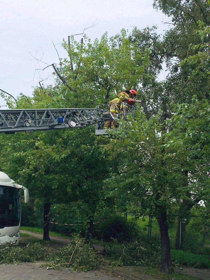 Dochodziła godzina 7 rano, gdy strażnicy miejscy z VII Oddziału Terenowego otrzymali zgłoszenie od mieszkańców, że na tyłach nieczynnego toru kolarskiego, na drzewie wisi gałąź. Funkcjonariusze pojechali na ulicę Chrzanowskiego. Nieopodal przystanku autobusowego nad chodnikiem zauważyli urwany przez wichurę konar topoli, który zawisł na innych gałęziach. Pod nimi w zatoce parkingowej stały dwa zaparkowane autobusy. Strażnicy wezwali straż pożarną. Zagrożony teren funkcjonariusze zabezpieczyli taśmą ostrzegawczą. Wezwano telefonicznie właścicieli autobusów, którzy usunęli pojazdy z zagrożonego miejsca i zamknięto ruch na ulicy Chrzanowskiego. Dopiero wtedy strażacy mogli przystąpić do usuwania niebezpiecznej gałęzi. Przejazd ulicą przywrócono dopiero po godzinie 10.30.