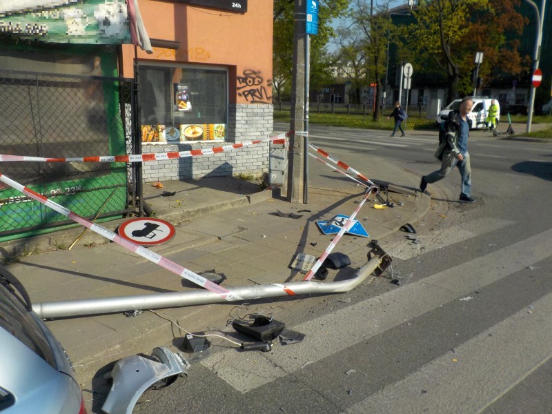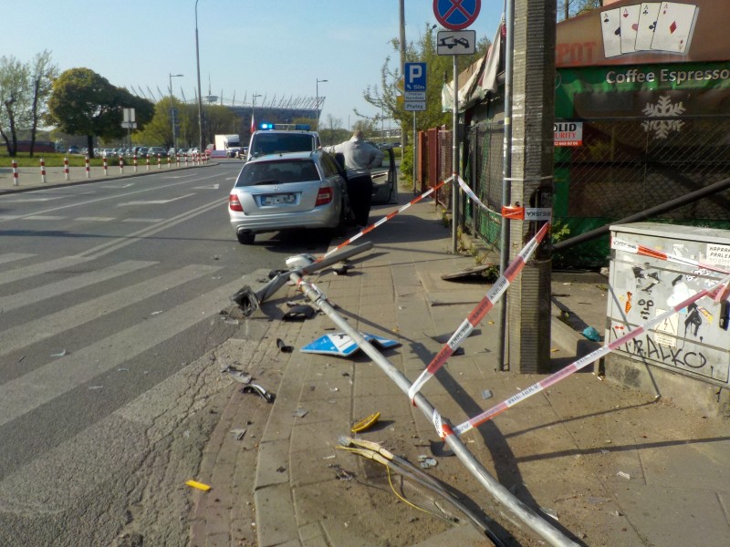 Do zdarzenia doszło około godziny 8.15. Kierujący mercedesem kombi nie zapanował nad swoim autem i wpadł na słup sygnalizacji drogowej oraz znak drogowy. Oba elementy infrastruktury zostały przez auto przewrócone. Z ziemi wystawały przewody elektryczne. Strażnicy miejscy zabezpieczyli je i wezwali policję i służbę dyżurną ZDM. 30-letni kierowca tłumaczył, że w jego pojeździe zawiodły hamulce. Mężczyzna był trzeźwy. Wyjaśnieniem dokładnej przyczyny zdarzenia zajęła się policja. Do usuwania skutków kolizji przystąpiły służby.