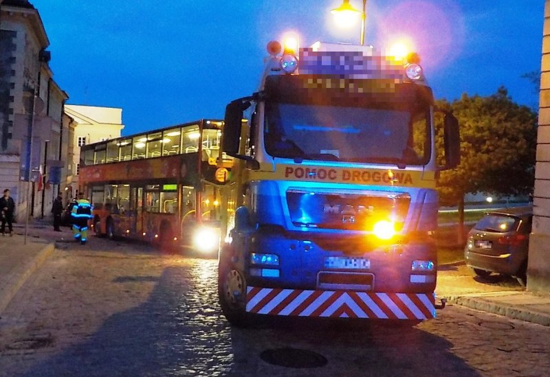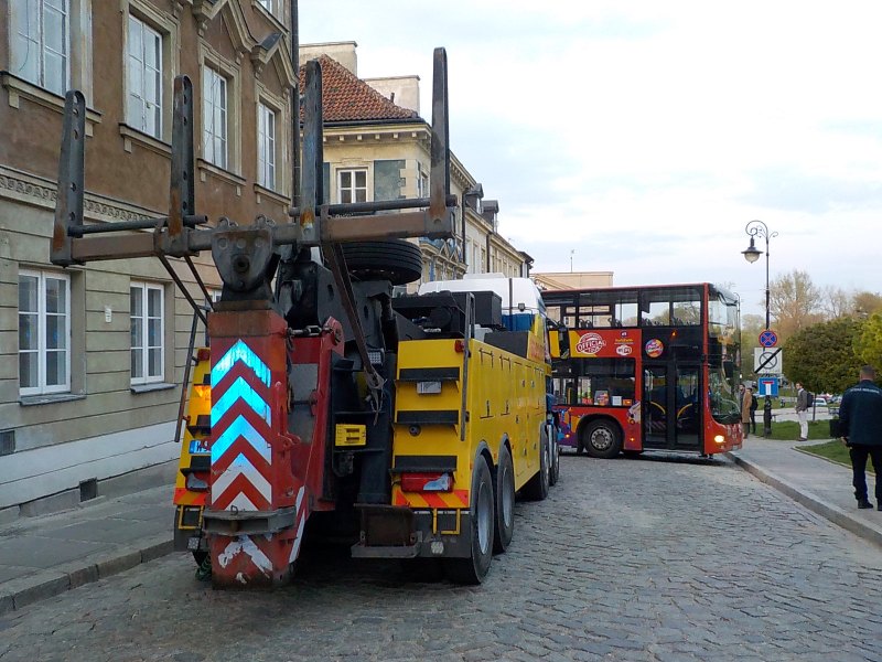 Do zdarzenia doszło około godziny 17.30. Piętrowy autobus turystyczny, podczas wykonywania manewru na spadzistej drodze, zawisł na krawężniku i kompletnie zablokował przejazd przez skrzyżowanie. Strażnicy miejscy pokierowali ruch mieszkańców inną drogą oraz wspierali kierowcę piętrusa, próbującego na różne sposoby wydostać się z pułapki. Bezskutecznie. Konieczne było wezwanie potężnego podnośnika, a także mechanika - ponieważ w trakcie prób pokonania przeszkody, w autobusie awarii uległ układ przeniesienia napędu.