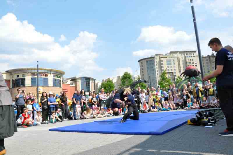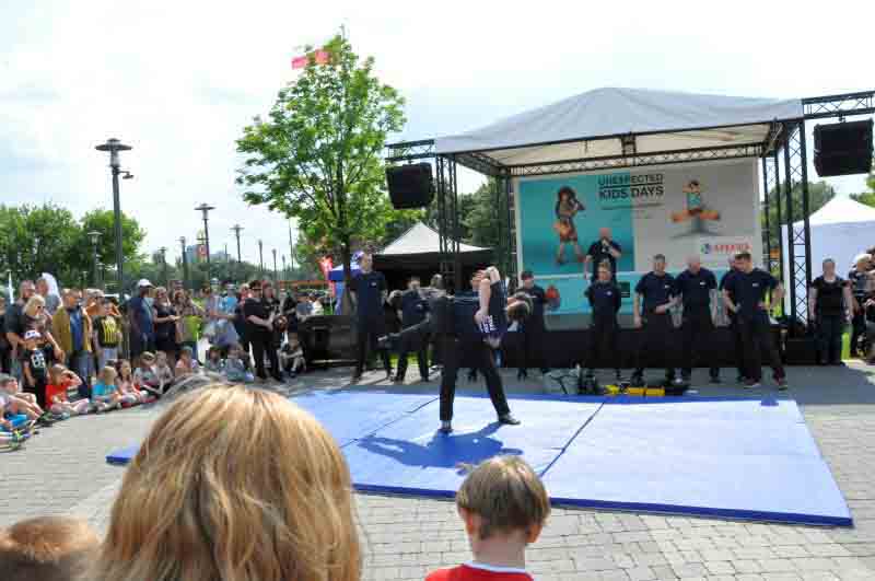 Gdy prowadzący zapowiedział występ grupy pokazowej, przed matą zjawiło się bardzo dużo osób chcących obejrzeć umiejętności funkcjonariuszy. Strażnicy zaprezentowali techniki walki oraz sposoby obezwładniania napastników. Brawa przerywały kolejne prezentacje, zapowiadane i opisywane w czasie ich trwania przez starszego inspektora Piotra Leszczyńskiego.