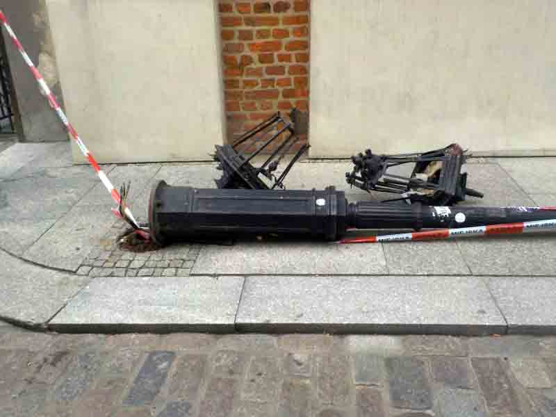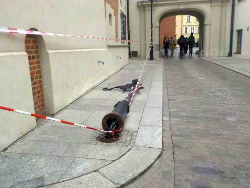 Do nietypowego zdarzenia doszło wczoraj na pl. Zamkowym w Warszawie. Strażnicy patrolujący okolicę dostali zawiadomienie, że na chodniku vis á vis Urzędu Stanu Cywilnego leży zabytkowa latarnia. Na miejscu zastali wyrwany z podłoża słup i sterczące z ziemi kable. Co prawda tego dnia wiało dość silnie, jednak nie było wątpliwości: latarni nie powaliły siły natury. Strażnicy zabezpieczyli zagrażające przechodniom elementy, wezwali stosowne służby, a sami podjęli się ustalenia sprawcy. Dzięki dobrej znajomości okolicy i wsparciu okolicznych firm i instytucji – udało się: był nim kierowca zaopatrujący jedną z restauracji. Około godziny 10:40 staranował on furgonetką latarnię, lecz zamiast zawiadomić odpowiednie służby, na własną rękę zamiótł szkło, zabytkowe kinkiety zaciągnął na tyły jednej z kamienic i odjechał.