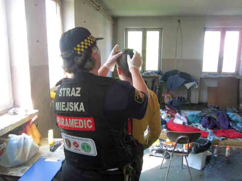 - W jednym z koczowisk w pobliżu Pileckiego podeszła do nas kobieta mówiąc, że jest w pobliżu mężczyzna, który od kilku dni nic nie je i nie pije – mówi st. insp. Dorota Widłak, ratownik medyczny i strażnik miejski. – Rzeczywiście, podczas rozmowy przyznał, że od czterech dni nie chce mu się jeść ani pić. To już był sygnał, że sytuacja jest poważna. Zresztą już sam wygląd wskazywał, że pan ma problemy: był mocno wychudzony, z mocno zażółkniętą skórą. Nasze badania tylko potwierdziły obawy: wycieńczenie, odwodnienie, arytmia, chora wątroba. Wezwaliśmy na miejsce pogotowie, które po wykonaniu swoich badań zabrało mężczyznę do szpitala.