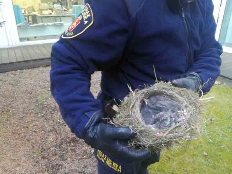 17 kwietnia rano strażnicy z Ekopatrolu otrzymali zgłoszenie od pracowników Centrum Zdrowia Dziecka o gnieździe z małymi ptakami, które znajduje się na ziemi w patio. Po przybyciu do Centrum pracownicy zaprowadzili strażników do miejsca, gdzie znajdowały się pisklęta. Specjaliści z Ekopatrolu stwierdzili, że są to małe kosy. Trzy były w gnieździe, jeden obok niego. Nie były ranne i nie miały żadnych obrażeń. Po dłuższej obserwacji oraz dzięki informacjom od pracowników CZD okazało się, że matka piskląt cały czas je dokarmia i dba o swoje maleństwa. Strażnicy podjęli decyzję o przeniesieniu gniazda w bezpieczniejsze miejsce w obrębie patio. Cały czas byli obserwowani przez czujną matkę czterech małych kosów. Po zaobserwowaniu, że ptak bez problemu odnalazł nowa lokalizację gniazda, strażnicy opuścili teren CZD.