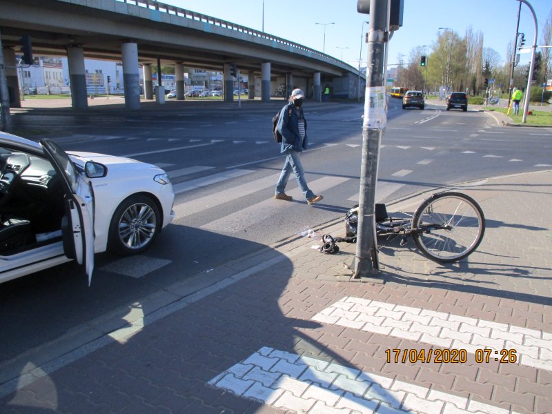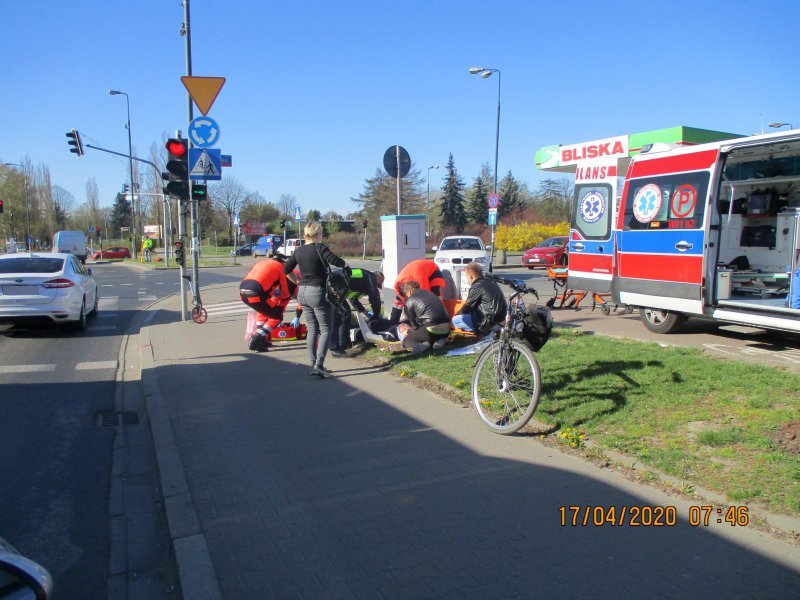 2020 04 pomoc rowerzyscie 01Do groźnego wypadku doszło na skrzyżowaniu Alei Prymasa Tysiąclecia i Górczewskiej. Dzięki szybkiej reakcji strażników poszkodowany rowerzysta natychmiast otrzymał pierwszą pomoc.
