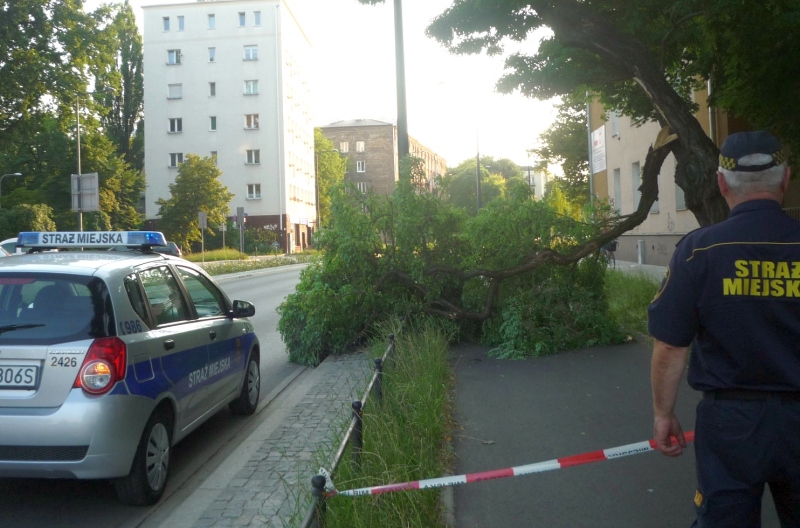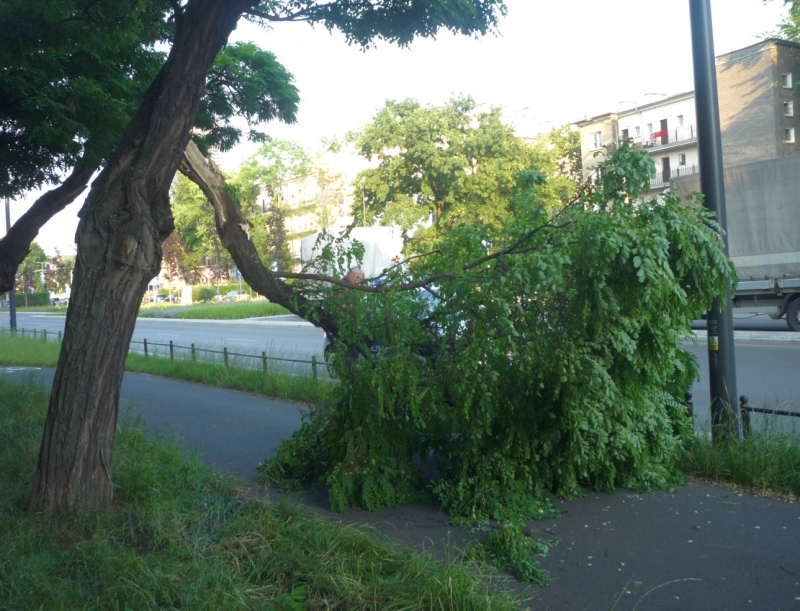 Około godziny 18.50, jadąc ulicą Górczewską pomiędzy ulicami Szlenkierów, a Tyszkiewicza funkcjonariusze IV Oddziału Terenowego zauważyli ułamany konar. Ogromna gałąź zwisała nad ścieżką rowerową zagradzając całą jej szerokość oraz fragment prawego pasa jezdni. Na dodatek zdarzenie miało miejsce tuż przed zakrętem, a więc konar był niewidoczny dla jadących z naprzeciwka. Strażnicy miejscy wezwali straż pożarną. Kwadrans po godzinie 19 strażacy odcięli konar i złożyli na terenie zielonym, gdzie nie będzie już zagrażał użytkownikom ścieżki rowerowej.